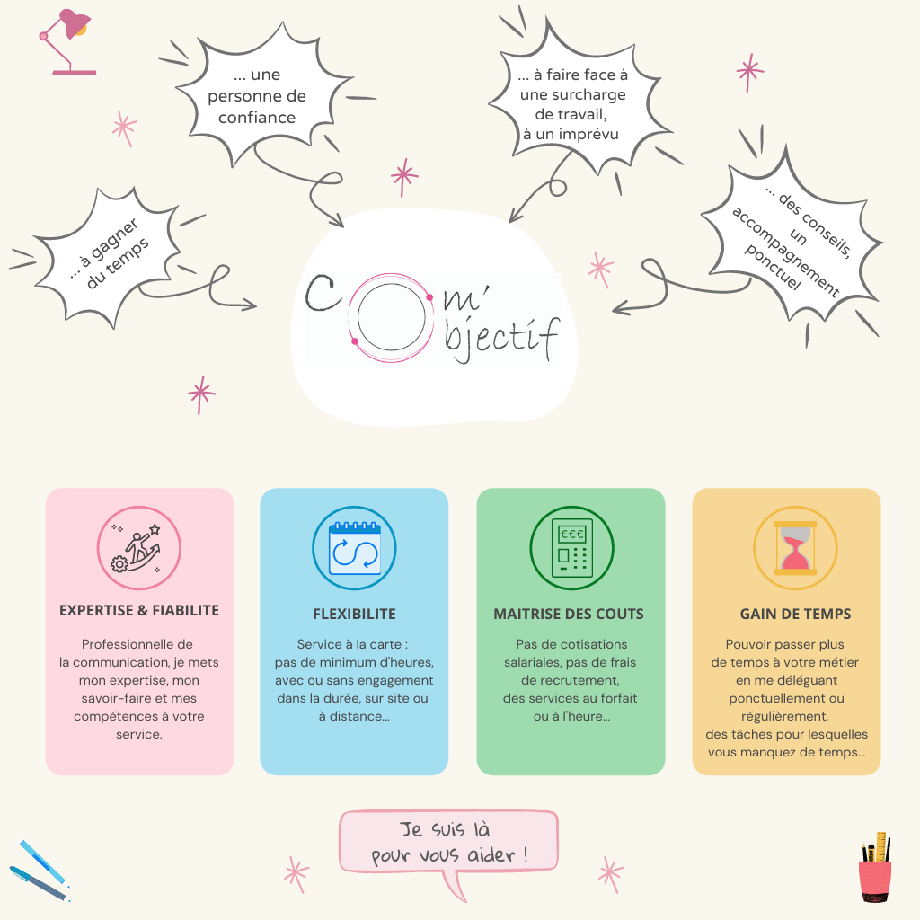 A distance ou sur site, ponctuellement ou régulièrement, j’ai « Com’ Objectif » de mettre mon savoir-faire à votre service !